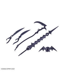 Dieses „30 Minutes Sisters“-Waffenset von Bandai enthält eine Sense, eine Schere und ein Großschwert! Die Schere kann als zwei Schwerter verwendet werden, indem man die Klingen trennt; die Klinge des großen Schwertes besteht aus mehreren Teilen und kann am Rücken als schwanzförmiges Rüstungsteil befestigt werden, das mit Hilfe von Verbindungsstücken (eine Auswahl an Gelenken ist enthalten) gebogen werden kann. Durch die Verwendung der in der „30 Minutes“-Serie üblichen Öffnungen und Pfosten mit einem Durchmesser von 3 mm können diese Waffen mit fast jeder „30 Minutes Sisters“-Figur verwendet werden!