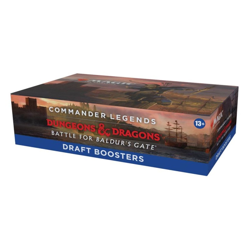 Drafte ein Commander-Deck in der Welt von Dungeons & Dragons. Jeder Commander Legends: Schlacht um Baldur's Gate Draft-Booster enthält 20 Magic-Karten und 1 Spielstein-/Werbekarte in einer Kombination aus 1-4 Karten der Seltenheit selten oder höher (2: 37 %; 3: 6 %; 4: < 1 %), 3-6 nicht ganz so häufigen und 13-15 häufigen Karten. 1 Karte beliebiger Seltenheit ist eine traditionelle Foilkarte. Sagenhaft seltener Foil-Planeswalker ohne Rand in < 1 % der Booster.