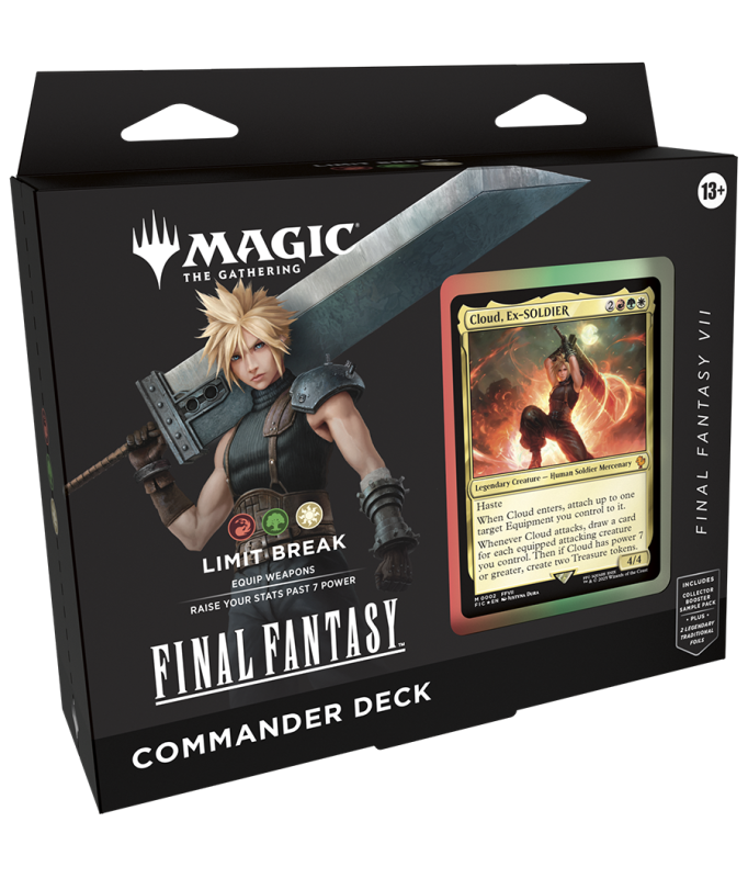 Tauche ein in die legendäre Welt von FINAL FANTASY mit diesem Set aus 4 spielfertigen Commander-Decks, die jeweils von den Kultspielen FINAL FANTASY VI, VII, X und XIV inspiriert sind.