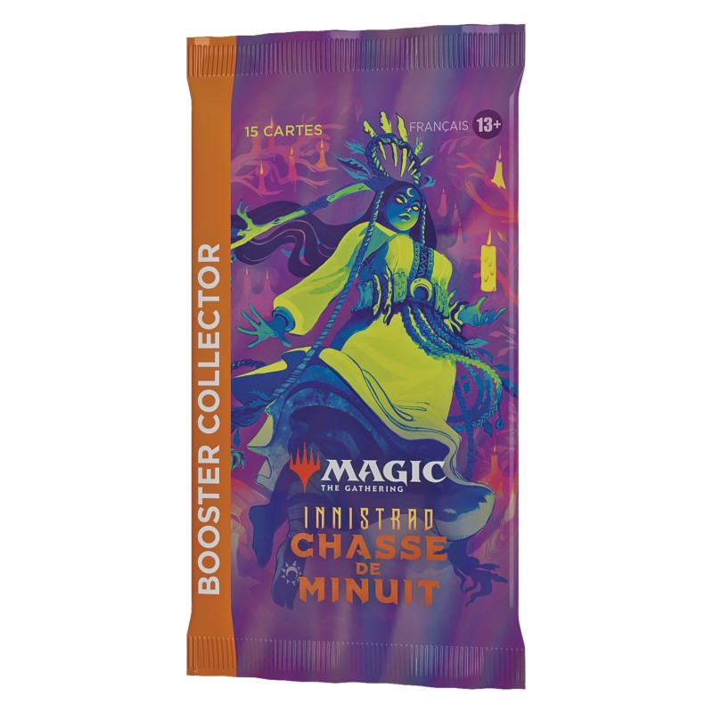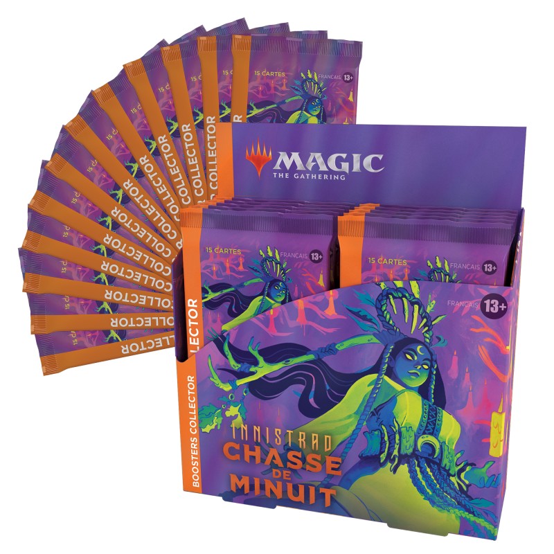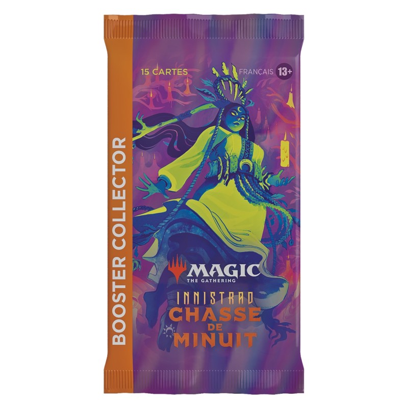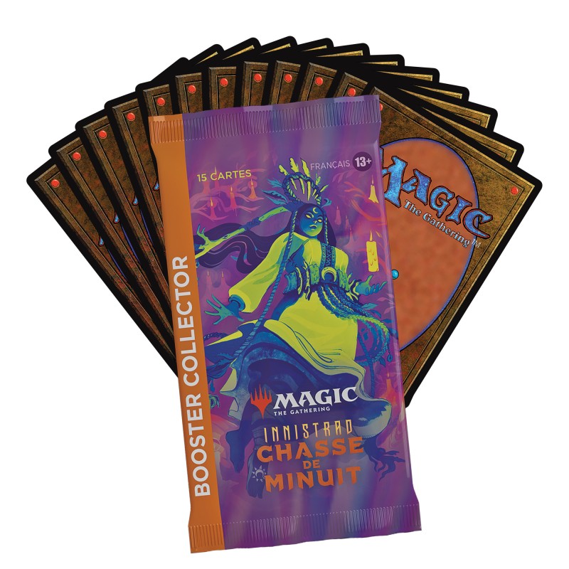 Ein Innistrad: Mitternachtsjagd Sammler-Booster enthält 15 Magic: The Gathering Karten und 1 doppelseitige Foil-Spielsteinkarte, darunter eine Kombination aus 5 seltenen und/oder sagenhaft seltenen Karten, 2-5 nicht ganz so häufigen Karten, 4-7 häufigen Karten und 1 Länderkarte. Jeder Booster enthält insgesamt 10 traditionelle Foilkarten und insgesamt 8 Karten mit speziellen Drucken – darunter Showcase-Karten, Karten ohne Rand und Karten mit erweitertem Kartenrand.