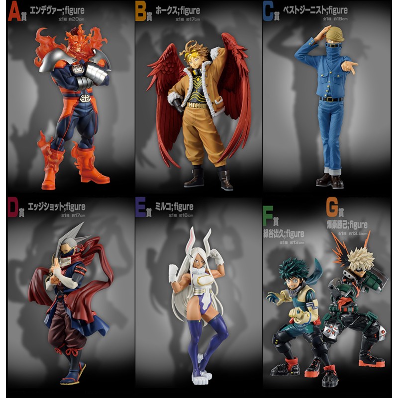 > Los A: Flame Hero Endeavor 20cm > Los B: Wing Hero Hawks 17cm > Los C: Fiber Hero Best Jeanist 19cm > Los D: Ninja Hero Edge Shot 17cm > Los E: Rabbit Hero Mirko 16cm > Los F: Izuku Midoriya 13cm > Los G: Katsuki Bakugo 13,5cm > Lot H : Acrylic Stand 8cm > Los I :Towel 20cm > Los J :Charm 6cm > Last One Preis Free Bonus Last Purchase Katsuki Bakugo Last One Version 13,5cm * Das Bild kann vom tatsächlichen Produkt abweichen. * Der Inhalt kann ohne vorherige Ankündigung geändert werden.