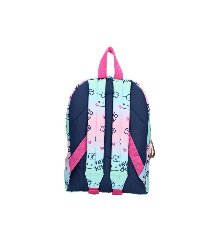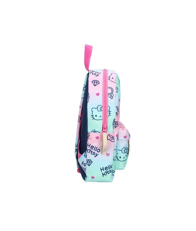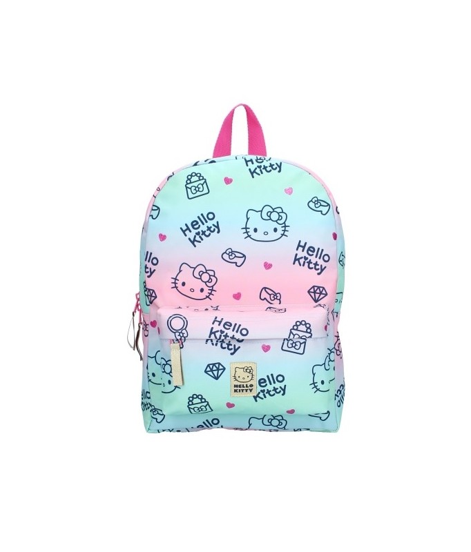 Mit diesem Hello Kitty Rucksack aus der "Cheerful"-Kollektion wird jedes Kind gerne in die Schule gehen! Die fröhlichen Farben der Katze und ihre niedlichen kleinen Köpfe machen diese Schultüte zu einer wahren Schönheit. Sie ist in Rosa, Grün und Blau gehalten und mit einem goldenen Logo und Reißverschlüssen versehen. Die Schultergurte sind verstellbar und rosafarben. Die Tasche hat ein großes Hauptfach und eine geräumige Fronttasche. Der Alloverdruck umfasst Herzen, Schuhe, Taschen, Hello Kitty ihren Kopf und ihren Namen.