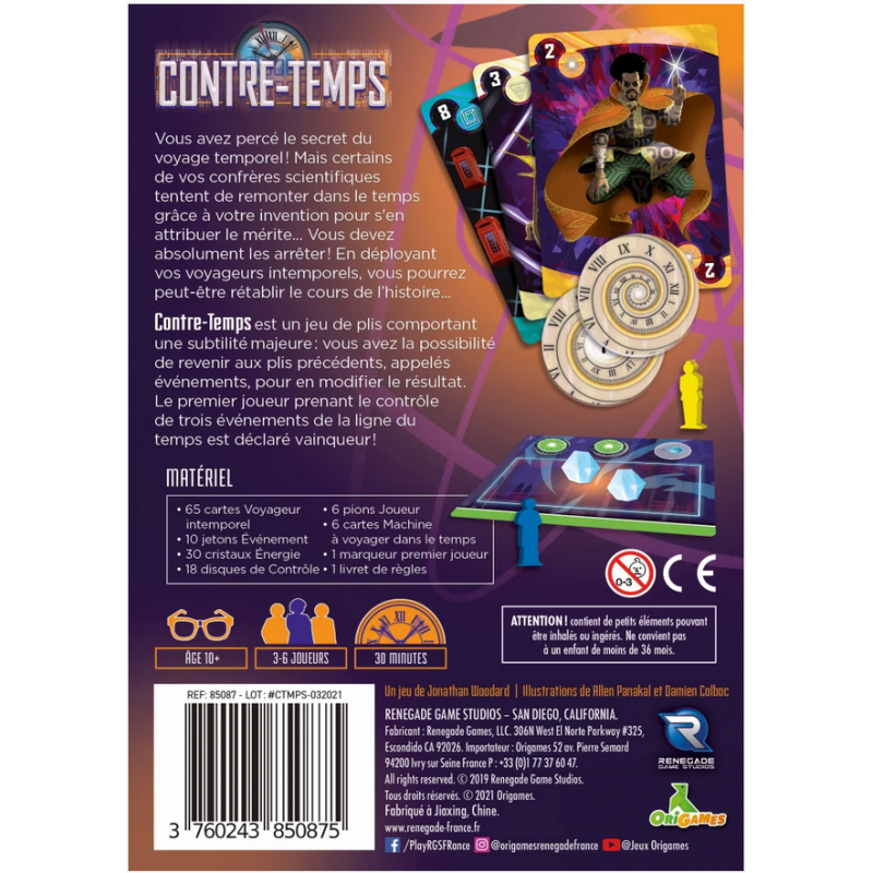Falten Sie die Zeit nach Belieben! DIE GESCHICHTE Sie haben es geschafft! Sie haben das Geheimnis der Zeitreise gelüftet! Leider versuchen einige Ihrer Wissenschaftlerkollegen, mithilfe Ihrer Erfindung in die Vergangenheit zu reisen, um die Lorbeeren für sich zu beanspruchen ... Sie müssen sie unbedingt aufhalten! Wenn Sie Ihre Zeitreisenden einsetzen, können Sie vielleicht den Lauf der Geschichte wiederherstellen ... DAS SPIEL Contre-Temps ist ein Spiel mit Stichen, das eine wichtige Feinheit aufweist: Sie können zu vorherigen Stichen, den sogenannten Ereignissen, zurückkehren und deren Ergebnis ändern. Ein gewonnener Stich ist also noch nicht gewonnen. Verteidigen Sie ihn bis zum Ende des Spiels oder fordern Sie die Stiche Ihrer Konkurrenten heraus. Der erste Spieler, dem es gelingt, die Kontrolle über drei Ereignisse auf der Zeitleiste zu übernehmen, wird zum Sieger erklärt! Spieler: 3-6 Alter: 10+ Dauer: 30 Min.