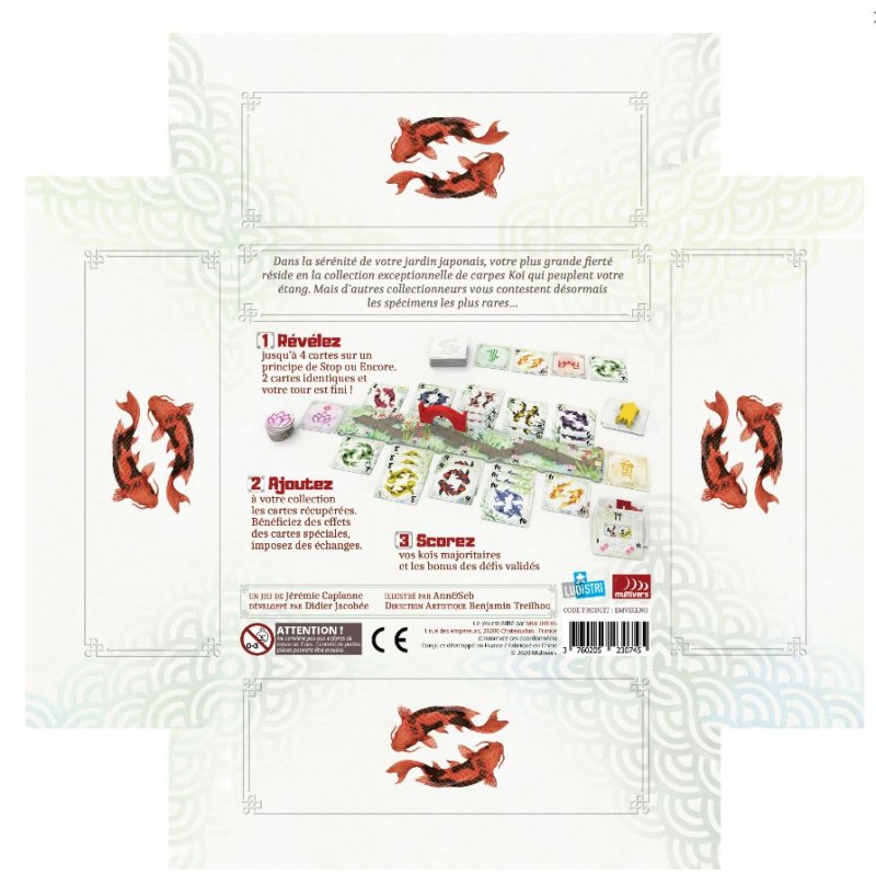 In Ike No Koi ist jede Karpfenkarte so oft wie ihr Wert vorhanden. Sie werden versuchen, Karpfen zu sammeln, um die Mehrheit in den verschiedenen Farben von Karpfen zu erhalten. Achten Sie darauf, nicht zu gierig zu sein: Sie enthüllen zwei identische Karten und die anderen werden zuerst verwendet!