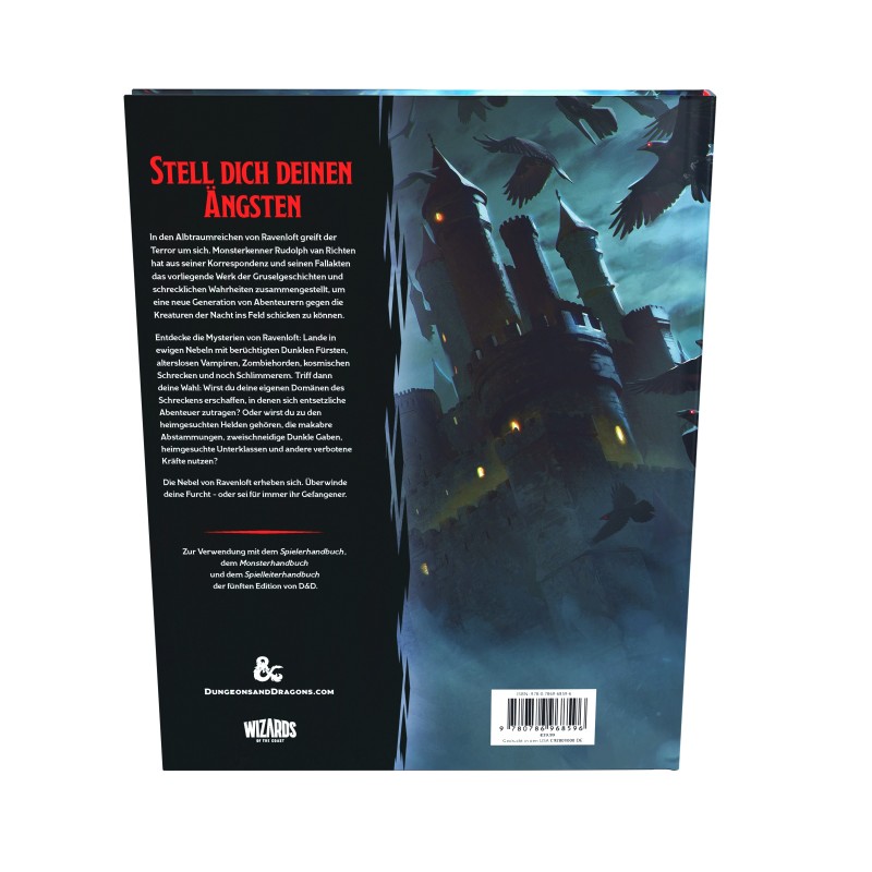 Game in German. Dungeons & Dragons : Van Richten's Guide to Ravenloft Explore the horrors of Ravenloft in this campaign book for the world's greatest role-playing game. Terror is descending on the nightmarish realm of Ravenloft. No one knows this better than monster expert Rudolph Van Richten. To arm a new generation against the creatures of the night, Van Richten has compiled his correspondence and investigative files in this book full of frightening stories and terrifying truths. - Take a trip (perhaps even of your own free will) to the Half Plane of Fright: each area has its share of horrors, exciting story hooks and an array of macabre characters. - Create your own D&D horror setting, add tension with optional rules, and get tips on how to make your game as terrifying as you want it to be - Create characters with bloodlines to vampires, undead and witches, horror-themed subclasses, and discover the history of the Investigator and 'gifts of darkness' that could prove to be a double-edged sword. - Unleash nightmarish monsters from an extensive bestiary, and browse a collection of mysterious items - Explore Ravenloft with this included Dungeons & Dragons adventure: play it on its own or add it to your existing game for some spooky fun