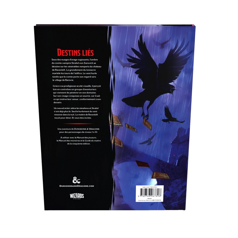 Dungeons & Dragons : The Curse of Strahd (French version) Unlock the mysteries of Ravenloft in this chilling adventure designed for the world's best role-playing game Under heavy black clouds, the figure of a vampire, Count Strahd von Zarovich, stands against the ancient walls of Ravenloft Castle. Thunder rumbles against the castle's towers. The wind howls more loudly as he looks away towards the village of Barovia. Far below, a group of adventurers has just entered his land, which does not escape his eagle eyes. Strahd gave a barely perceptible smile: everything was going according to plan. He knew they were coming, and he knows why they are coming. He had planned everything. A flash of lightning illuminates the darkness, but Strahd has disappeared. It is midnight. Only the wind disturbs the night air. The lord of Ravenloft Castle has guests for dinner. You are one of the guests.