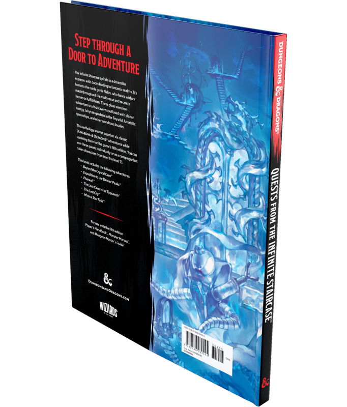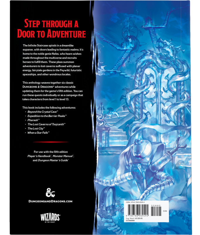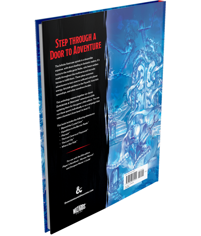 Quests from the Infinite Staircase embraces the magic of the most beloved Dungeons & Dragons adventures of all time. Your journey begins in the Infinite Staircase, a dreamlike expanse with doors leading to fantastical worlds, where you'll meet Nafas, a noble genie who fulfills wishes with the help of valiant heroes—like you! As you explore what lies beyond each door, embark on timeless adventures and make memorable moments with your party. This handpicked collection contains 6 remastered first edition adventures, complete with striking settings and a lovable cast of characters. These unforgettable quests can be run individually or as a delightful campaign that takes characters from level 1 to 13.