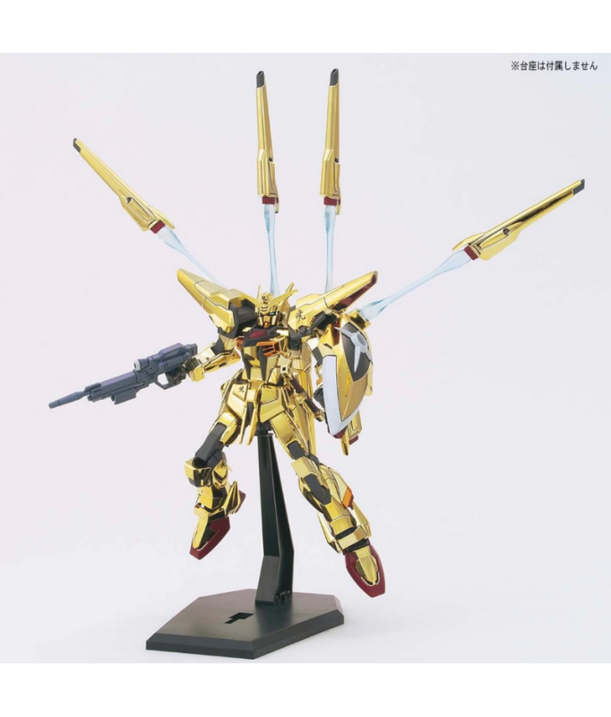 If you couldn't get enough of gold-plated kits with the Hyakushiki, now you can start collecting the Akatsuki! Very nicely-done with "mekki"-plating on the major parts (which of course can be removed if you prefer to paint your kits, by careful application of ordinary household bleach); all the parts snap together and don't require paint. Nifty clear effect parts for the Akatsuki's various weapons are included, which is a nice bonus. Gundam decals for markings, and foil stickers for the eyes, are also included.