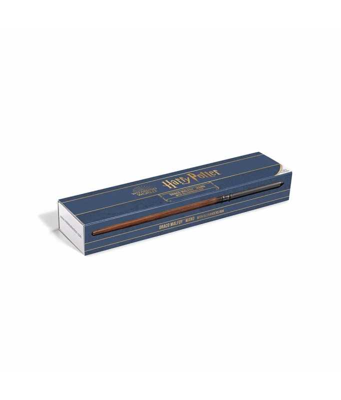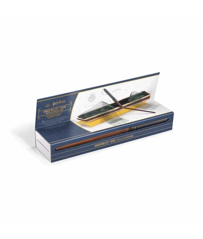 Authentic, official replica of Draco Malfoy's wand from the Harry Potter films. This resin wand is presented in an Ollivander collection box, with a velvet case molded to the shape of the wand. Two veils on either side of the box cover the wand, giving it a noble appearance. The wand imitates the look of hawthorn wood, with a black handle and the rest of the wand a darker wood color.