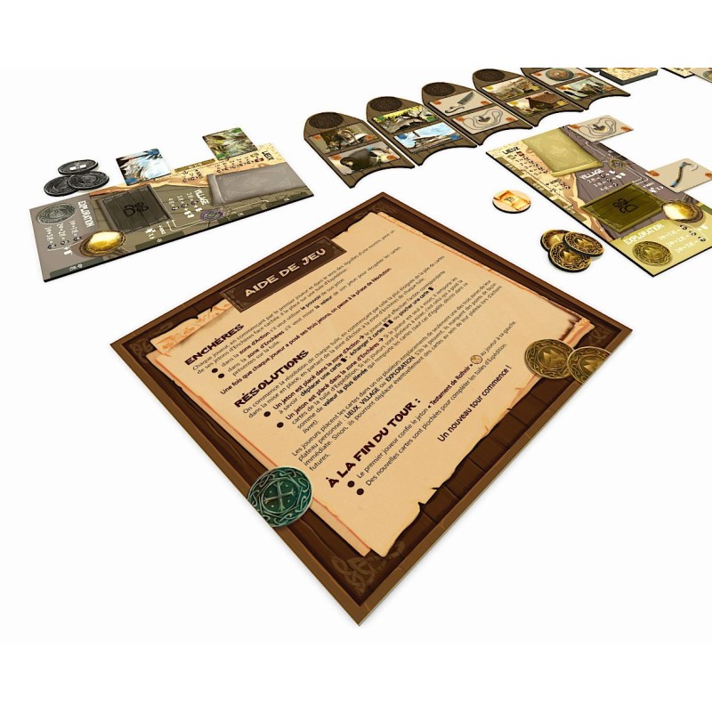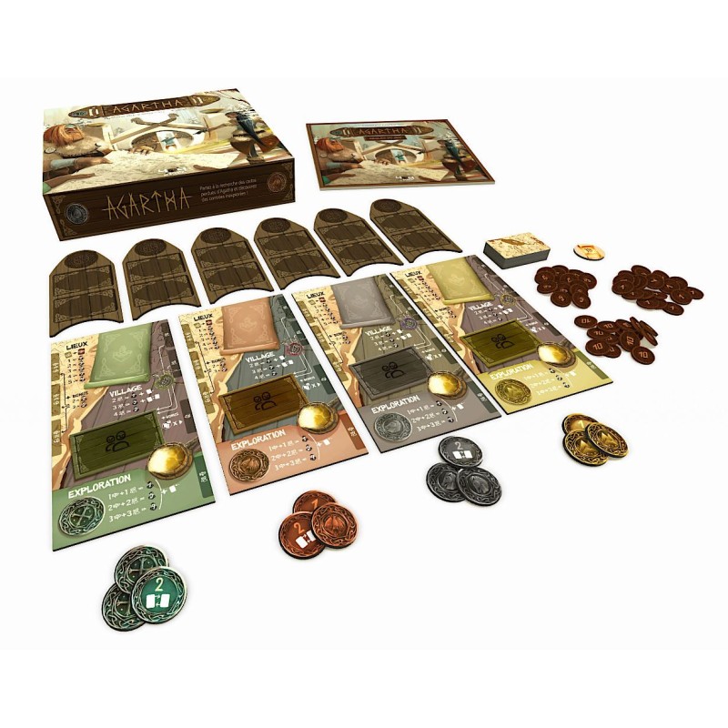 Game in French. Explore the lost world of Agartha! Explore the forgotten world of Agartha Explore and meet more people to discover the lost world of Agartha! Rolhnir spent his life exploring underground worlds. He left you a priceless legacy: the maps of Agartha. You are his descendants, ready to take up the torch and explore the world. To find his secret maps, you must follow in your ancestor's footsteps and travel through unknown lands in search of information. At the beginning of each round, players will use their bidding tokens to collect resources from the expedition tiles. They have to gamble to get different kinds of cards, which they have to place as well as possible on their personal board. The goal is to maximize these resources and multiply the combos! Explore as many locations as possible, meet characters, and collect sacred amulets to learn as much as possible about the underground worlds of Agartha. Players: 2-4 Age: 10+. Duration: 30-45 min