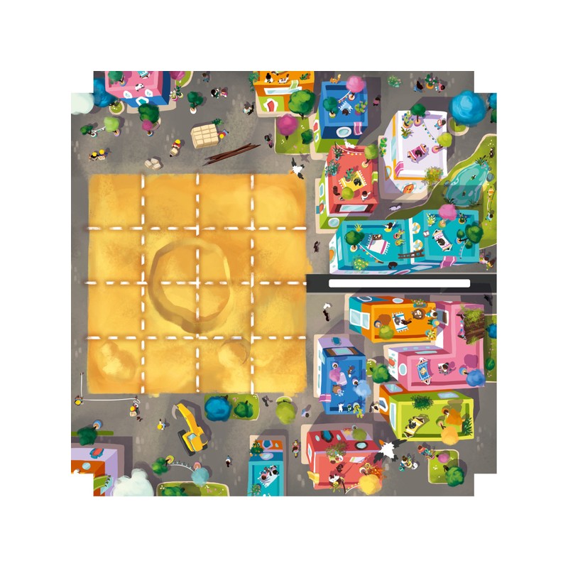 At each round two players become partners to build the building drawn on a map as quickly as possible.