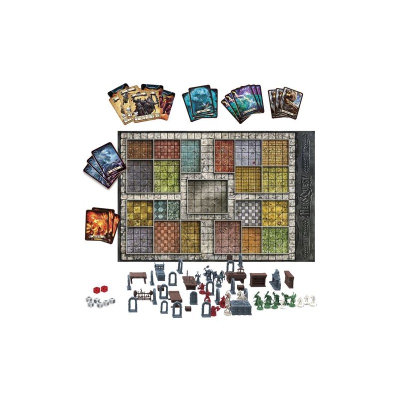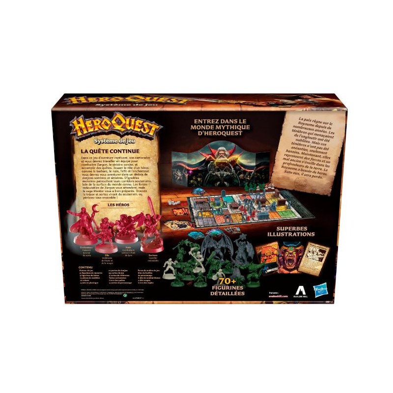 In the dungeon exploration board game HeroQuest, heroes work as a team to complete epic quests, find treasure and fight the forces of evil. It's a semi-cooperative game in which one player takes on the role of Zargon, the game master, and the others play the roles of 4 mythical heroes: the barbarian, the dwarf, the elf and the enchanter. These heroes must work as a team to overcome labyrinths and dark dungeons filled with monsters. Players will be able to immerse themselves in a fantastic adventure thanks to the superb illustrations and detailed miniatures (over 65). The game includes 14 quests and almost infinite replayability, as players can create their own quests and stories. All you need to do is get a few friends together and you're ready to spend a wonderful evening fighting evil! Avalon Hill's HeroQuest board game is a fantasy dungeon adventure where players must work as a team to battle terrifying monsters and complete epic quests. -MYTHIC HEROES: The kingdom needs champions to face the evil forces of Zargon, the Wizard of Terror. Four heroes have answered the call: the barbarian, the dwarf, the elf and the enchanter. This semi-cooperative board game includes highly detailed miniatures on 25 mm bases and realistic furniture to create an immersive gaming experience. Players: 2-5 Age: 14+ Duration: -
