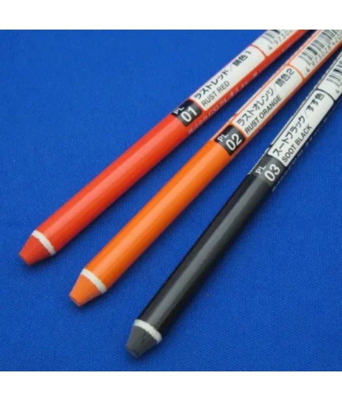 Lipstick-like "weathering liner!" Easy to apply. Set includes PL01 Rust Red, PL02 Rust Orange, and PL03 Soot Black.
