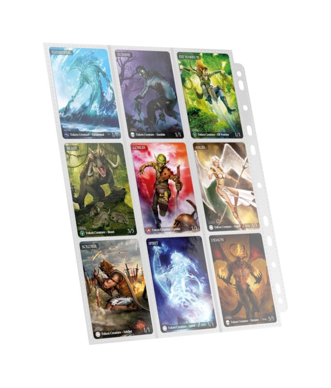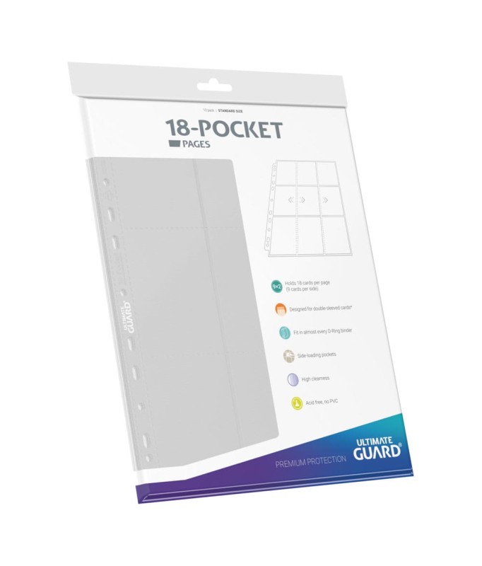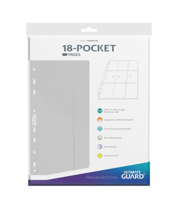 High quality double-sided pages (9 pockets on each side) compatible with most D-Ring binders thanks to the double-reinforced 11-hole strip. Each pack contains 10 pages to store and transport up to 180 double-sleeved trading cards.