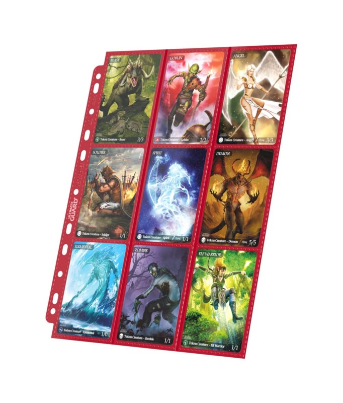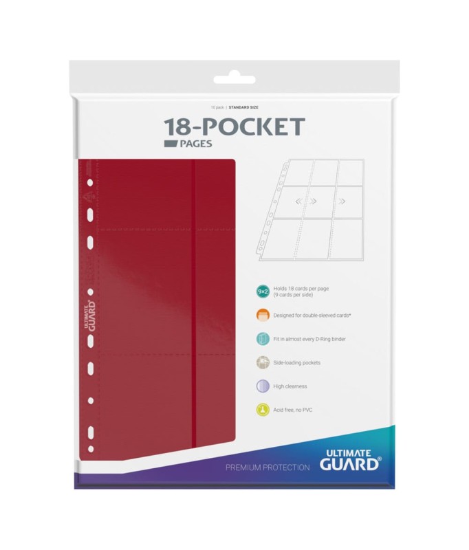 High quality double-sided pages (9 pockets on each side) compatible with most D-Ring binders thanks to the double-reinforced 11-hole strip. Each pack contains 10 pages to store and transport up to 180 double-sleeved trading cards.