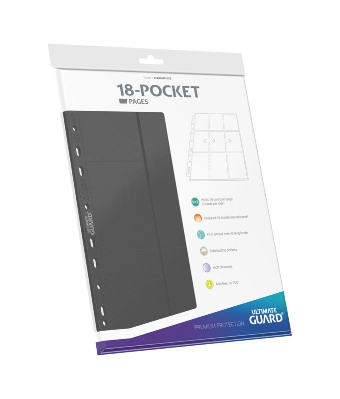 High quality double-sided pages (9 pockets on each side) compatible with most D-Ring binders thanks to the double-reinforced 11-hole strip. Each pack contains 10 pages to store and transport up to 180 double-sleeved trading cards.