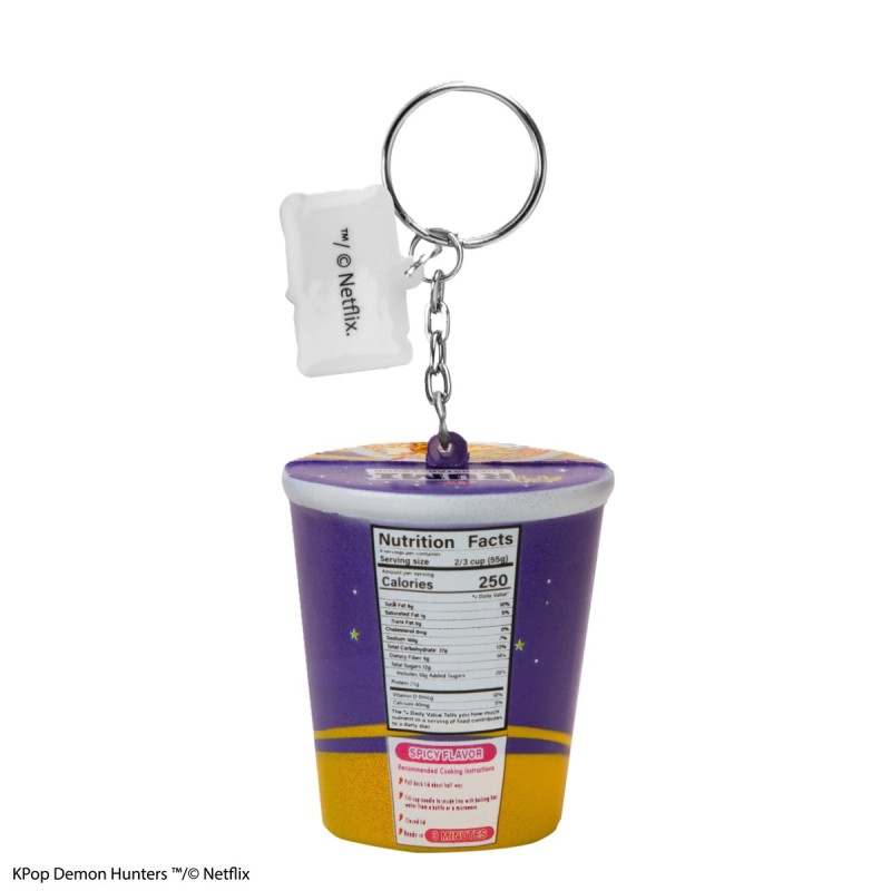 This tiny, squishy keychain, which glows in Rumi's trademark cosmic purple, was inspired by her Superstar Flavor noodles. The cup design creates a striking contrast that immediately draws attention by combining bright yellow and flame-red accents with deep violet and midnight plum tones. Every component feels lively, graphic, and full of stage presence, from the eye-catching Rumi typography to the lively character illustration and whimsical nutrition label details. Its vivid color story becomes a tactile experience thanks to the soft PU texture, which adds a delightful squeeze.
