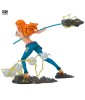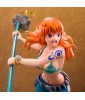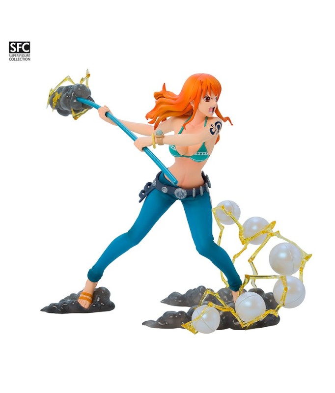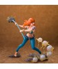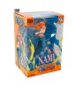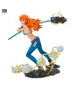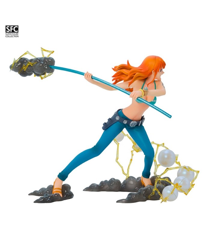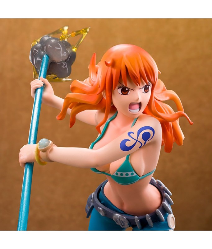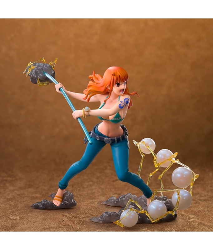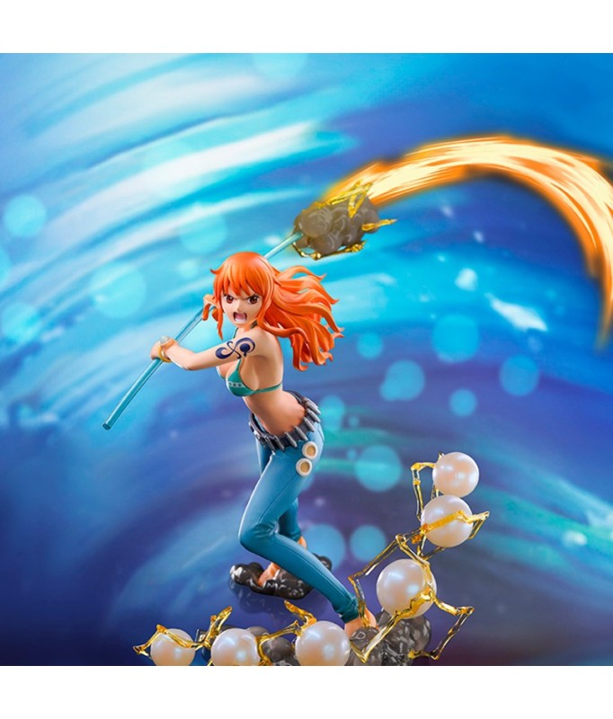 This Nami figurine in combat mode captures the moment she prepares to use her Climat-Tact to defend the Straw Hat crew. Her floating hair and dynamic posture are even more emphasized by the base, which features flashes of light and wind, illustrating the power of her weapon. A must-have for One Piece fans, showcasing Nami's strength and confidence in the midst of battle.