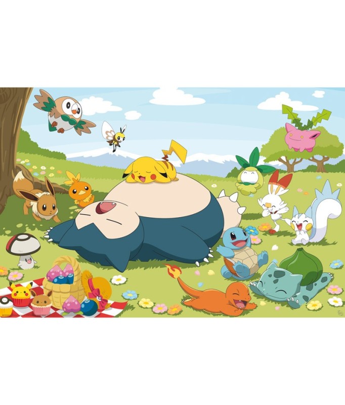 Share a moment of Pokémon sweetness and friendship with this poster ! Under a sunny sky, Snorlax, Pikachu, Eevee, Bulbasaur, Charmander, Squirtle... and many more gather around a delicious picnic to the delight of fans.