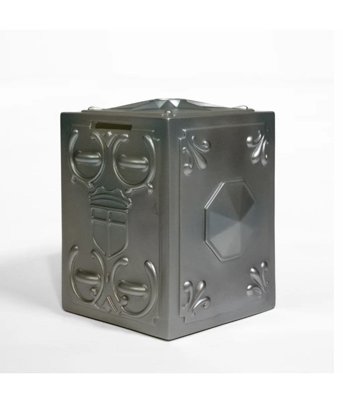 Money box featuring the Pandora Boxes from the Saint Seiya licence. Pandora Boxes are metal boxes that Saint wear on their backs, containing their sacred armour.