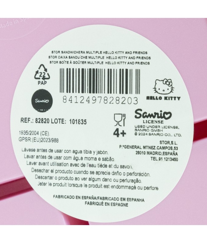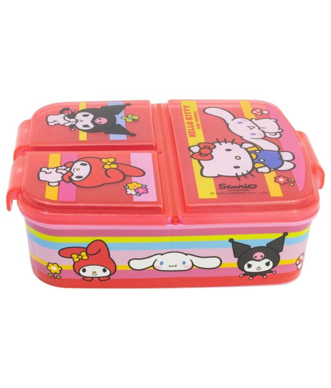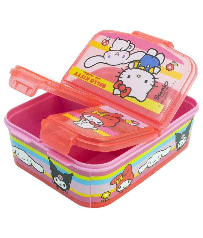 Hello Kitty and Friends 3-Compartment Multi-Sandwich Box for Kids An original and practical sandwich box with three compartments. Made of durable material, it will withstand accidental drops and bumps from everyday use. Decorated with attractive designs based on the main characters from their favorite series, little ones will love taking it with them wherever they go. - 1 large compartment and 2 small ones - BPA-free