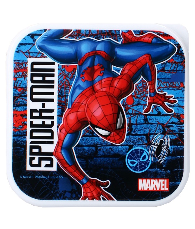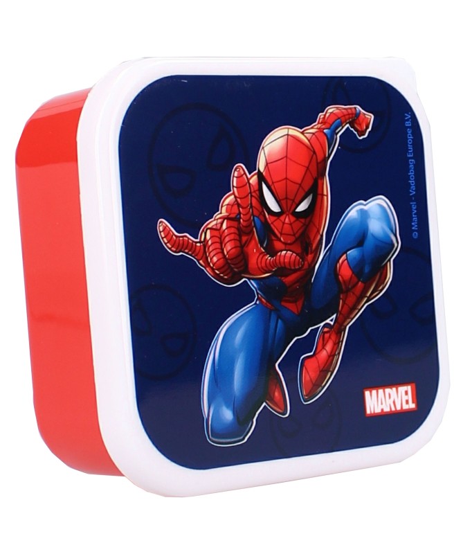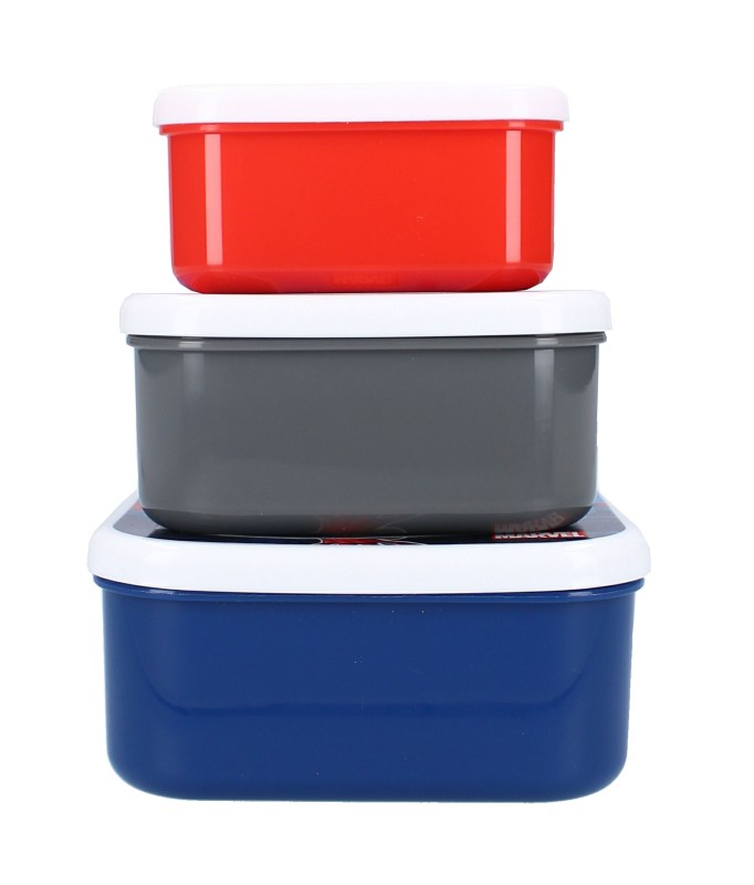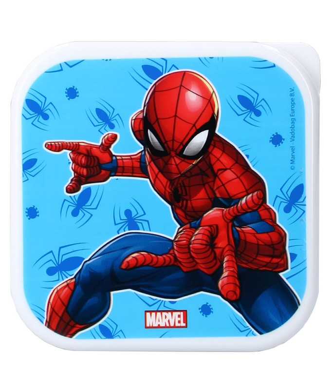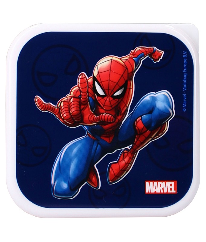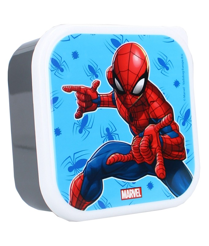 These cheerful snack boxes from Spider Man are ideal for taking a snack on the go. There are 3 snack boxes of different sizes. Furthermore, each snack box features a cool Spider Man print. The boxes are dark blue, grey and red in colour and close securely. Finally, they fit together easily for convenient storage.