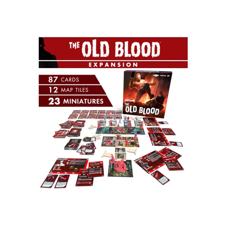Wolfenstein: The Old Blood offers players four new scenarios that constitute a prequel closed campaign with five new hero cards (and figurines) and the ability to control your own Mech. It includes two new bosses (The Monstrosity and Rudi Jäger) and three new types of enemies, each in two different variants.