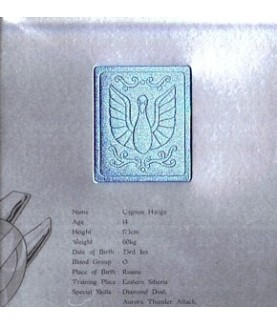 Une Plaque de métal argentée collée dans une double page en carton à l'éffigie du signe du zodiaque du personnage (comme sa Pandora box - si il en une), livrée avec certaines séries de Myth Cloth à Hong Kong, le tout pour un prix sensiblement suppérieur à la normale.