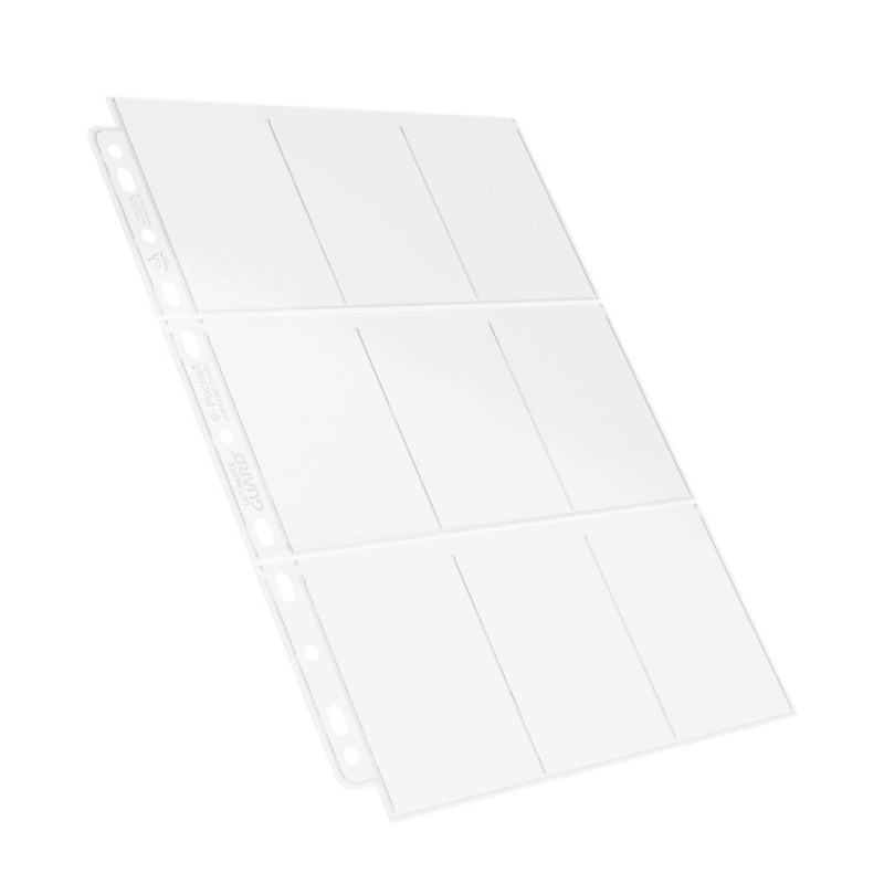 Pages haute qualité compatibles avec la plupart des classeurs D-Ring grâce à la bande 11 trous à double renfort. Chaque pack contient 100 pages pour ranger et transporter jusqu'à 900 cartes à collectionner en double-pochette (double-sleeve).