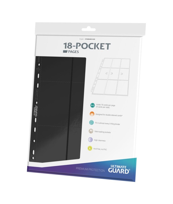 Pages haute qualité double-face (9 poches sur chaque face) compatibles avec la plupart des classeurs D-Ring grâce à la bande 11 trous à double renfort. Chaque pack contient 10 pages pour ranger et transporter jusqu'à 180 cartes à collectionner en double-pochette (double-sleeved).