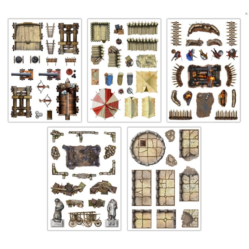 Add-On Scenery for RPG Maps - War & Siege est un pack de plus de 80 adhésifs statiques réutilisables à utiliser sur n'importe quelle carte ou surface laminée.