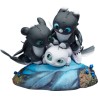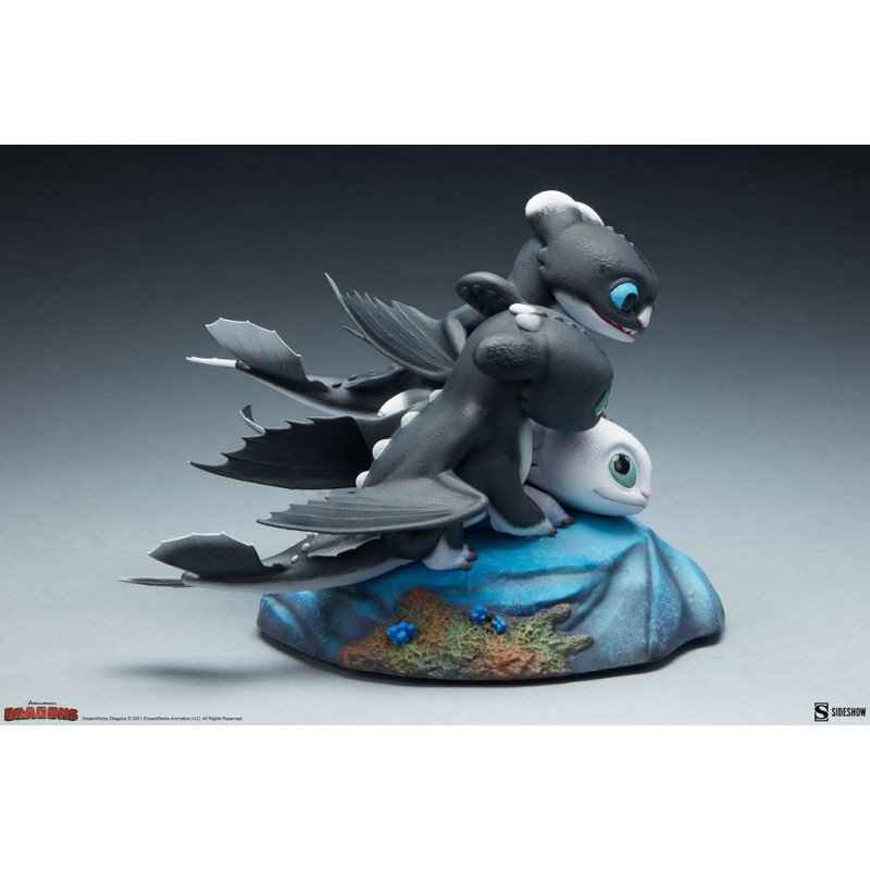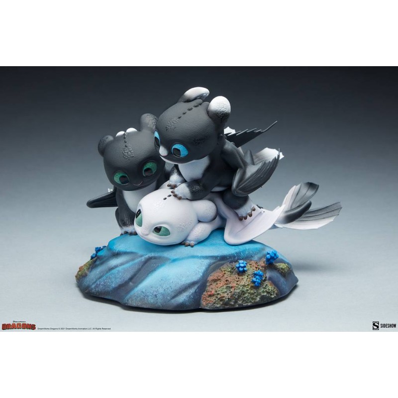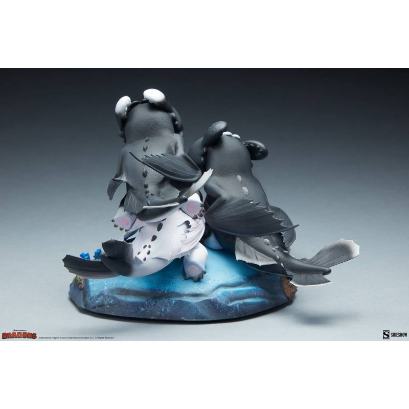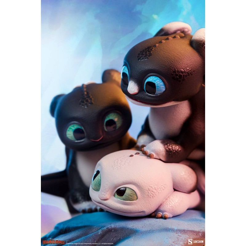 La statue Dart, Pouncer et Ruffrunner mesure 5,73 pouces de haut et 7,67 pouces de large. Le petit trio de dragons dégringole l'un sur l'autre sur une base de caverne rocheuse bleue avec des éléments floraux colorés. Également connus sous le nom de Night Lights, les adorables rejetons de Krokmou la Furie nocturne et de sa mère la Furie lumineuse représentent une nouvelle ère pour les dragons, qui trouvent le réconfort dans l'utopie luxuriante connue sous le nom de Hidden World (monde caché).