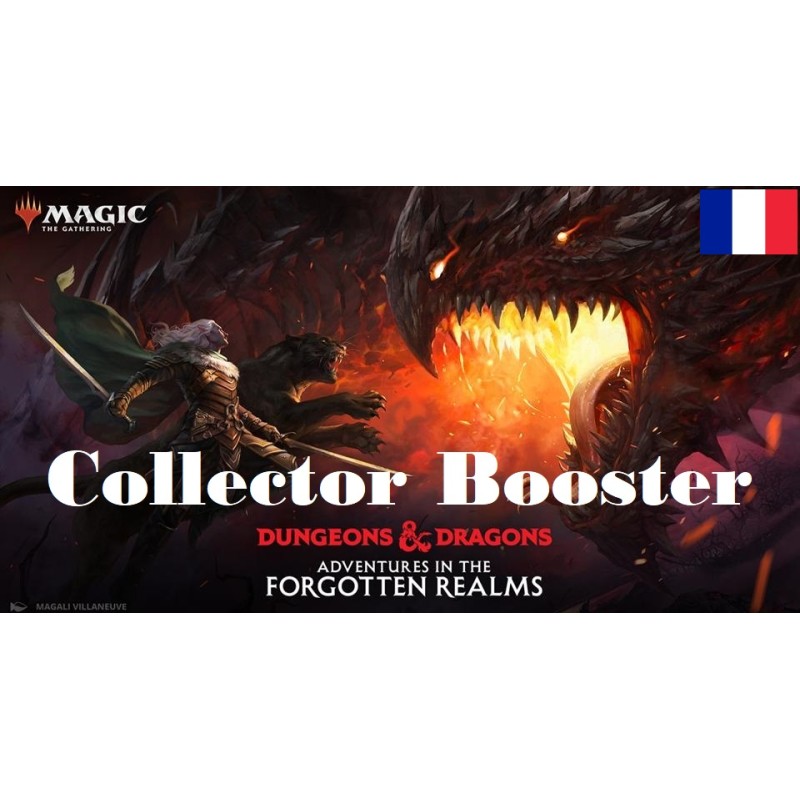 Chaque booster collector Forgotten Realms : Aventures dans les Royaumes Oubliés renferme 15 cartes Magic: The Gathering et un jeton Premium recto-verso traditionnel, avec une combinaison de 5 cartes rares et/ou rares mythiques, 2–5 cartes inhabituelles, 4–7 cartes courantes et une carte de terrain. Une carte de planeswalker sans bordure rare mythique Premium dans 4 % des boosters.