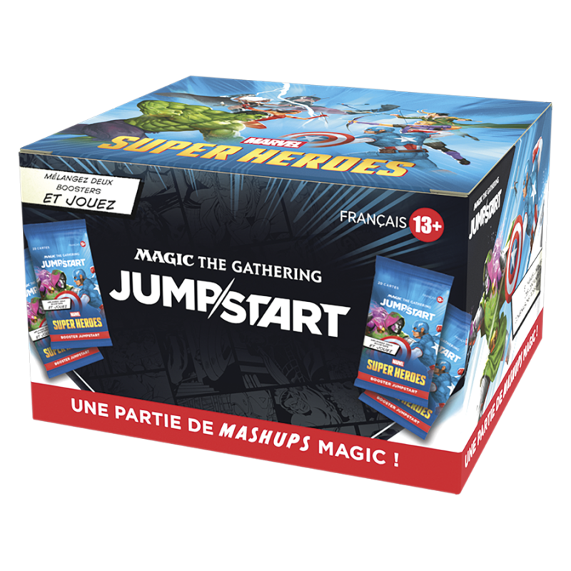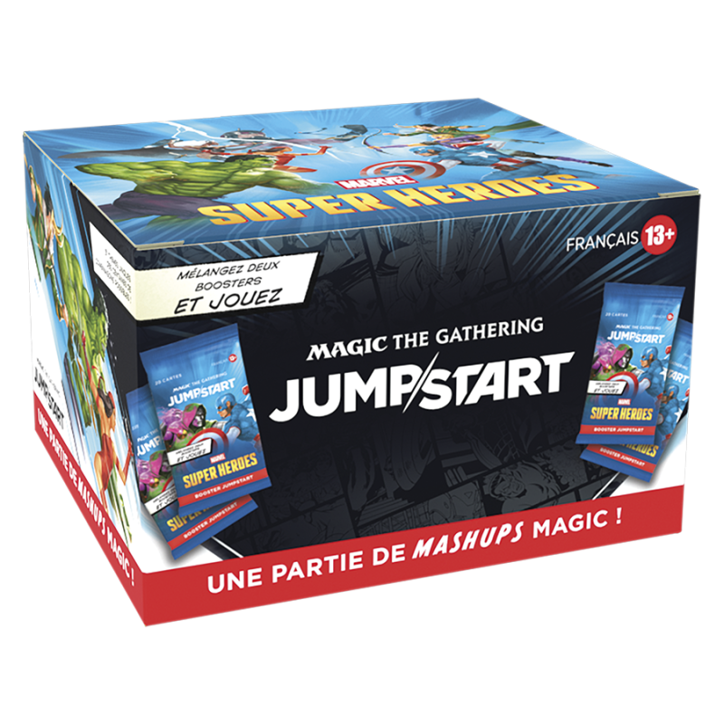 Le jeu aux combinaisons chaotiques s'associe à l'univers Marvel ! Prenez simplement deux boosters, mélangez-les et vous voilà prêt à jouer. Chaque booster contient tous les terrains dont vous pourriez avoir besoin, ainsi que l'un des 51 thèmes possibles de Marvel Super Heroes, combinez-en deux pour rassembler l'équipe de super-héros et de super-vilains de vos rêves, avant d'utiliser leurs redoutables capacités. Avec une construction de deck instantanée et de délicieux combos à thème, Jumpstart est parfait pour livrer une partie rapide ou apprendre à vos amis et à votre famille à jouer à Magic en s'amusant !