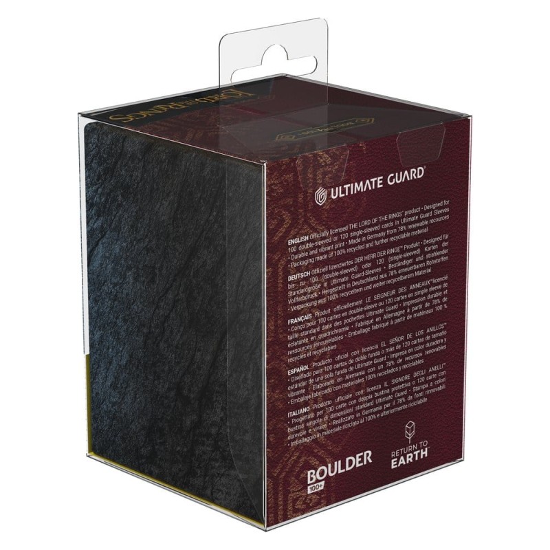 Le RTE Boulder 100+ est une deckbox fiable de notre série Return to Earth, avec une impression résistante et vive. Fabriqué en Allemagne à partir de 78 % de ressources renouvelables, le RTE Boulder 100+ de l'édition officielle The Lord of the Rings™ " Places of Middle-earth " d'Ultimate Guard peut contenir jusqu'à 100 cartes en double-sleeve avec des pochettes Ultimate Guard*. De plus, l'emballage de la deckbox est fabriqué à partir de matériaux 100 % recyclés.