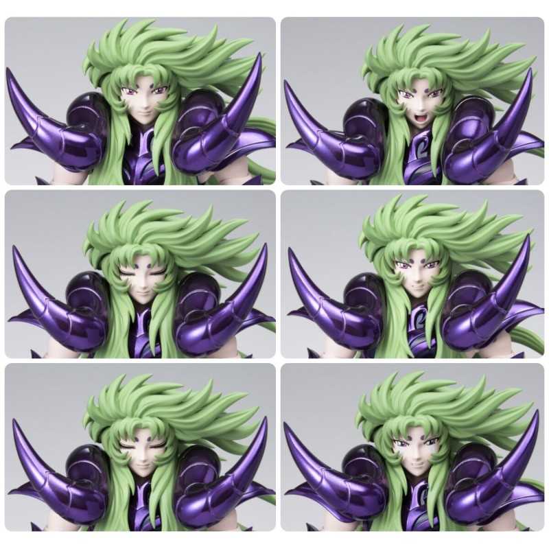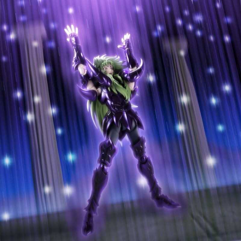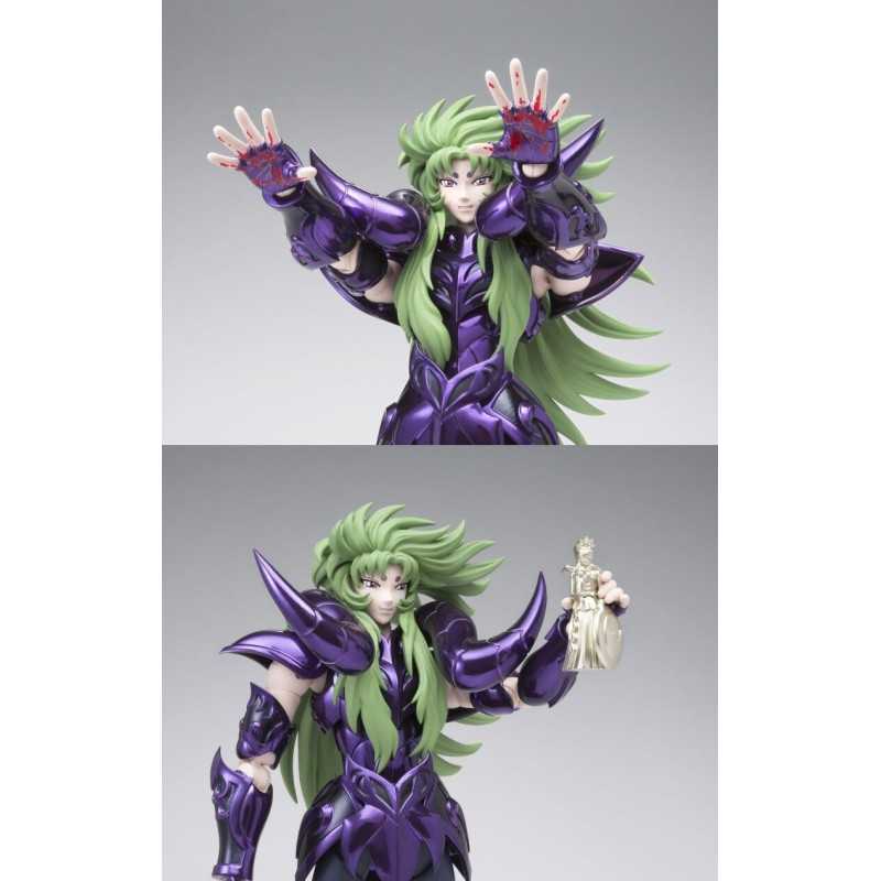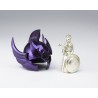 Figurine sous licence Saint Seiya de type Myth Cloth EX, avec corps en plastique totalement articulé et armure en très grande partie en métal, adaptable sur le porte armure (aussi appelé "Object" ou "Socle"), livré avec la figurine.