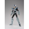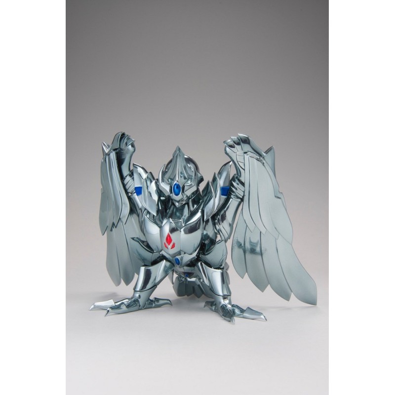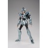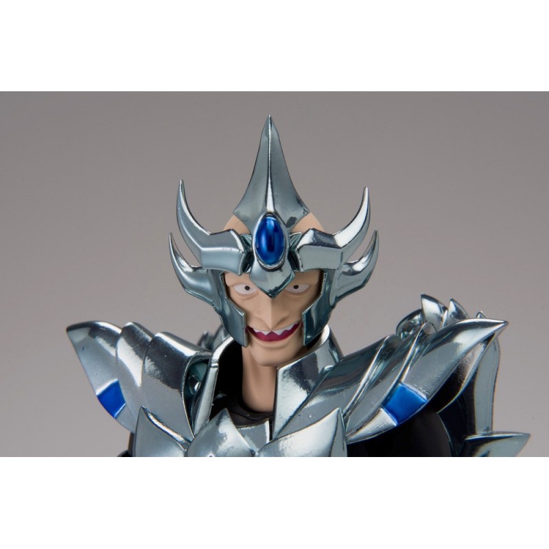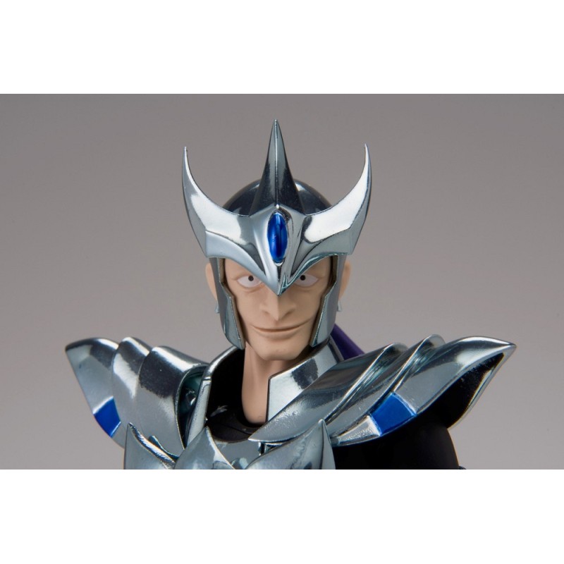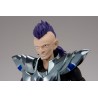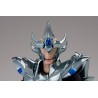 Figurine sous licence Saint Seiya de type Myth Cloth, avec corps en plastique totalement articulé et armure en très grande partie en métal, adaptable sur le porte armure (aussi appelé "Object" ou "Socle"), livré avec la figurine.